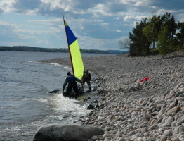 pořádně vyzkoušet. Volba padl a na Ladožské jezero. Má jenom 17.870 km 2 a není to doleko. A protože na podob né expedice je lepší jezdit ve více lidech, rozhodl jsem se koupit loďky rovnou dvě. Se sestrou a dvěma kamarády jsme akci naplánovali na druhou půlku červen ce. Tou dobou bývá na Ladožském jezeře průměrná teplota vody 18oC a vzduchu 30oC. V únoru jsme na poslední chvíli koupili letenky, protože už jich začínal být nedostatek. V květnu jsem vyřídil víza a koupil lodě. Cvičná sborka a rozborka lodí se vyplatila. Patka stěžně se při první stavbě musí přivrtat a akuvrtačku jsme sebou brát neplánovali. Konečně přišel den odletu a v Petrohradě se o dvacet stupňů ochladilo. Asi proto, že tam zrovna zasedala G8.