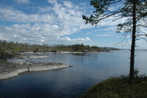 Po půlnoci se hladina vyrovnala do zrcadlového lesku a do dvou ráno jsme pádlovali na příhodné místo k přenocování. Až při odjezdu jsme se dozvěděli od místních, že není náhoda, ale pravidlo, že v noci na Ladožském jezeře vítr nefouká. Dospali jsme probdělou noc a vyrazili až ve čtyři odpoledne , když už pořádně foukalo od severozápadu a my vyrazili podél linie ostrovů na severovýchod.