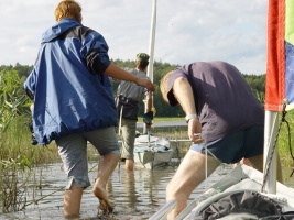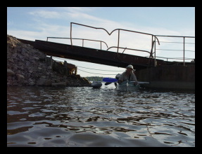 Sundali jsme stěžně a po jednom bočním plováku, a protáhli se pod pontonovým mostem přes průliv Vorssunsalmi.