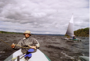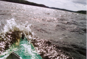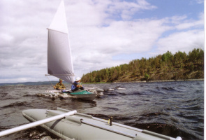 Druhý den v poledne poněkud neobvykle foukal již dost silný severní vítr. Vyrazili jsme směrem do průlivu Chonkasalonsjelkja. Zvedly se vlny, něco do metru a půl a neustále se snažily změnit našim lodím směr. Občas při poryvu větru zmizela příď pod hladinou, ale rychlým popuštěním otěže bylo vše zachráněno.