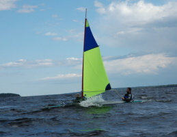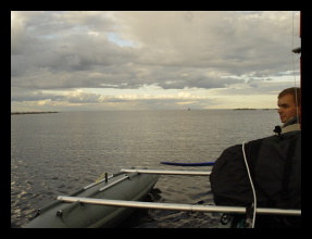 Když se po poledni probudil vítr a my, vyrazili jsme východoseverovýchodně k ostrovu Kjunsary. Po obloze se honili bílé načechrané obláčky a pod nimi visely mokré záclonky. Úspěšně jsme mezi záclonkami kličkovali, až nás jedna dostihla a po tři minuty na nás lila vodu jako z kýblu.