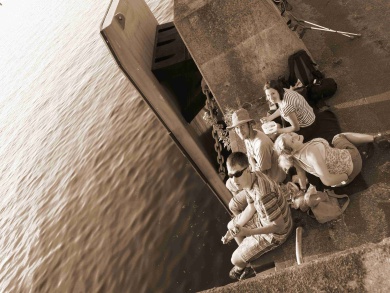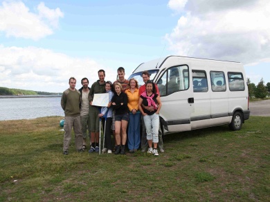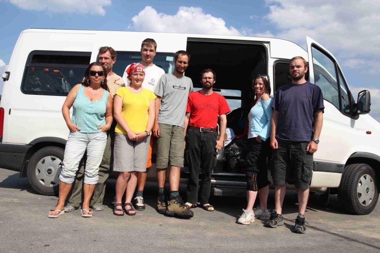 Sraz byl v Belgické ulici mezi osmou a devátou hodinou. Ve tři čtvrtě na devět přijel minibus. Nastalo balení a skládání věcí a lodí do minibusu. Odjezd byl naplánován na desátou hodinu. Pavel si zapomněl plavky, tak vyrazil na lov. Už jsme si mysleli, že se Pavel ztratil na Míráku, ale v 9:55 se objevil se svým úlovkem a se slovy „v Kenvelu na Václaváku měli čtyři kusy a jeden z nich mi byl a dokonce za 250,- Kč“. Když jsme čekali na Pavla, někteří účastníci využili chvilky a odskočili si. Petr šel Jarmile otevřít dveře a vrátil se. Za chvíli s křikem běžel zpět, protože ji v bytě zamkl a odešel. Nakonec ještě jednou běžel opravit splachování, protože ho někdo strhl. V plné slávě jsme vyrazili přesně v deset hodin na naší expedici ve složení řidič Jindřich plus Jarmila, Jirka a Jíťa, David a Pavel, Petr a já a moje dvě berličky.