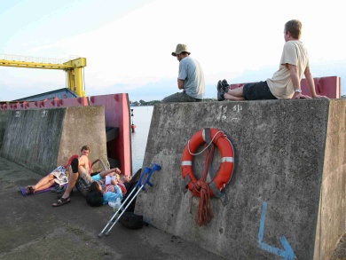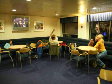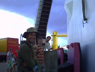 Cesta ubíhala, jen v Dubí jsme zastavili na česnečku a guláš a jeli dál. V sedm hodin večer jsme dorazili do Rostocku daleko od Prahy do přístavu. Tam si nás odmával pan „vrátný“ a zanavigoval nás, kam máme jít, abychom vyplnili formuláře na trajekt. Měli jsme spoustu času, tak jsme si sedli na břehu (na molo) a pozorovali vodu, lodě a navečeřeli se. Ve čtvrt na deset připlula naše loď a po dvou sklopených mostech se z ní vyvalila čtvrthodinová kalamita pro čtyřproudou dálnici. V půl desáté jsme nasedli do busu a čekali, až na nás přijde řada na nájezd na trajekt. Toho jsme se dočkali poměrně brzy. Zaparkovali jsme a vyrazili nahoru k restauraci a kajutám. David si dal typicky švédské masové kuličky s bramborem za jedenáct euro. Petr zalezl hned do spacáku a za chvíli usnul. My jsme počkali, alespoň do třičtvrtě na jedenáct, až se trajekt rozjede. Noc byla klidná, šofér strávil noc na kajutě s Jarmilou a my na pohodlných sedačkách v restauraci s velkými okny a dokud jsme byli v přístavu, tak i s hezkým výhledem.