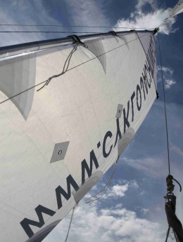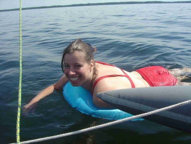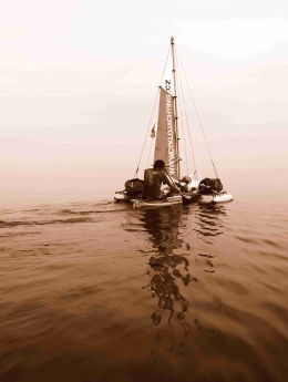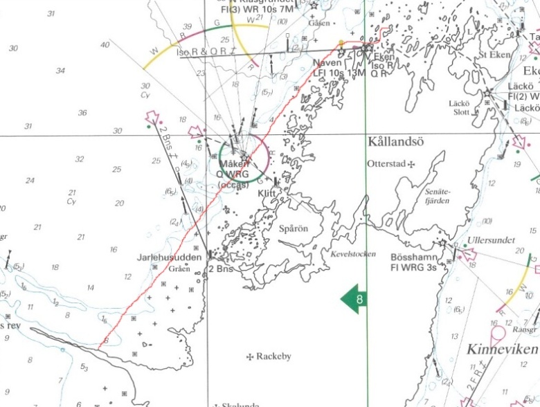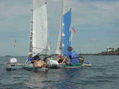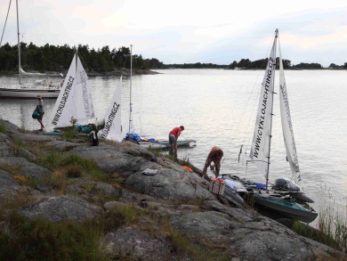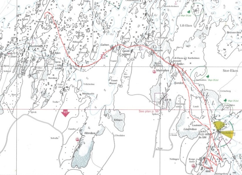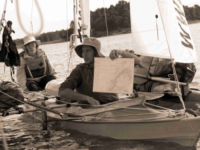 Druhý den ráno foukal slabý, proměnlivý vítr. V jedenáct jsme vypluli na pádla. Já jsem seděla u kormidla. Když už nás pádlování nebavilo, tak jsme se vykoupali z lodí. Když začal foukat vítr, koupání jsme nechali. Vítr zesílil a stabilizoval se na východojihovýchodním směru. Petr si přesedl na batohy na návětrném plováku, aby se závětrný plovák tolik nezanořoval a zbytečně nebrzdil. Takto jsme dopluli až k majáku Naven, kde vítr opět zeslábl a začal se točit. Na vodě u majáku jsme se všichni opět sešli. Rozhodli jsme se utábořit na ostrovech severovýchodně od Navenu. Jarmila s Jindrou chtěli spát hned na prvním šutru, ale přemluvili jsme je alespoň na ostrov Norh:na. Jindra prozkoumal ostrov a konstatoval, že tam žádné místo k táboření není. Vyslali jsme proto Davida a Pavla prozkoumat ostrov Klinth naproti. Než podali vysílačkou zprávu, Petr prozkoumal ze zvědavosti sám ostrov Norh:na a objevil pěkné místo na spaní. Pavel s Davidem sice na ostrově Klinth místo na přenocování našli, ale bylo plné mravenců. Byli jsme rádi, že Petr místo našel, protože jsme byli unavení.