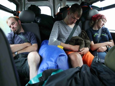 Brzy ráno jsme v Roztocku vyjeli z trajektu směrem na Prahu. Petr už seděl s námi vzadu. V Berlíně sjel Jindra z dálnice i z okruhu a jal se prodírat do centra. Několikrát jsem jej upozornila na možnosti nájezdu zpět na okruh, ale odbyl mne tím, že trefí. Tak jsme si prohlédli Říšský sněm, památník obětem Holocaustu a ztratili minimálně hodinu. Potom jsme všichni usnuli. Probudilo nás drncání od děr v dálnici a spatřili jsme okolo polské nápisy. Poslali jsme Petra zpět na pozici navigátora, a zakázali Jindrovi jakoukoliv vlastní volbu cesty. Vzápětí nás stavěla polská policejní hlídka, že řidič není připoutaný a zkontrolovala nám pasy. Na prvním sjezdu jsme uhnuli z dálnice na Wroclaw směrem na Liberec. Byla to náročná cesta po úzkých děravých silničkách. Do Prahy jsme dorazili jen s šestihodinovým zpožděním, naštěstí o den dříve.